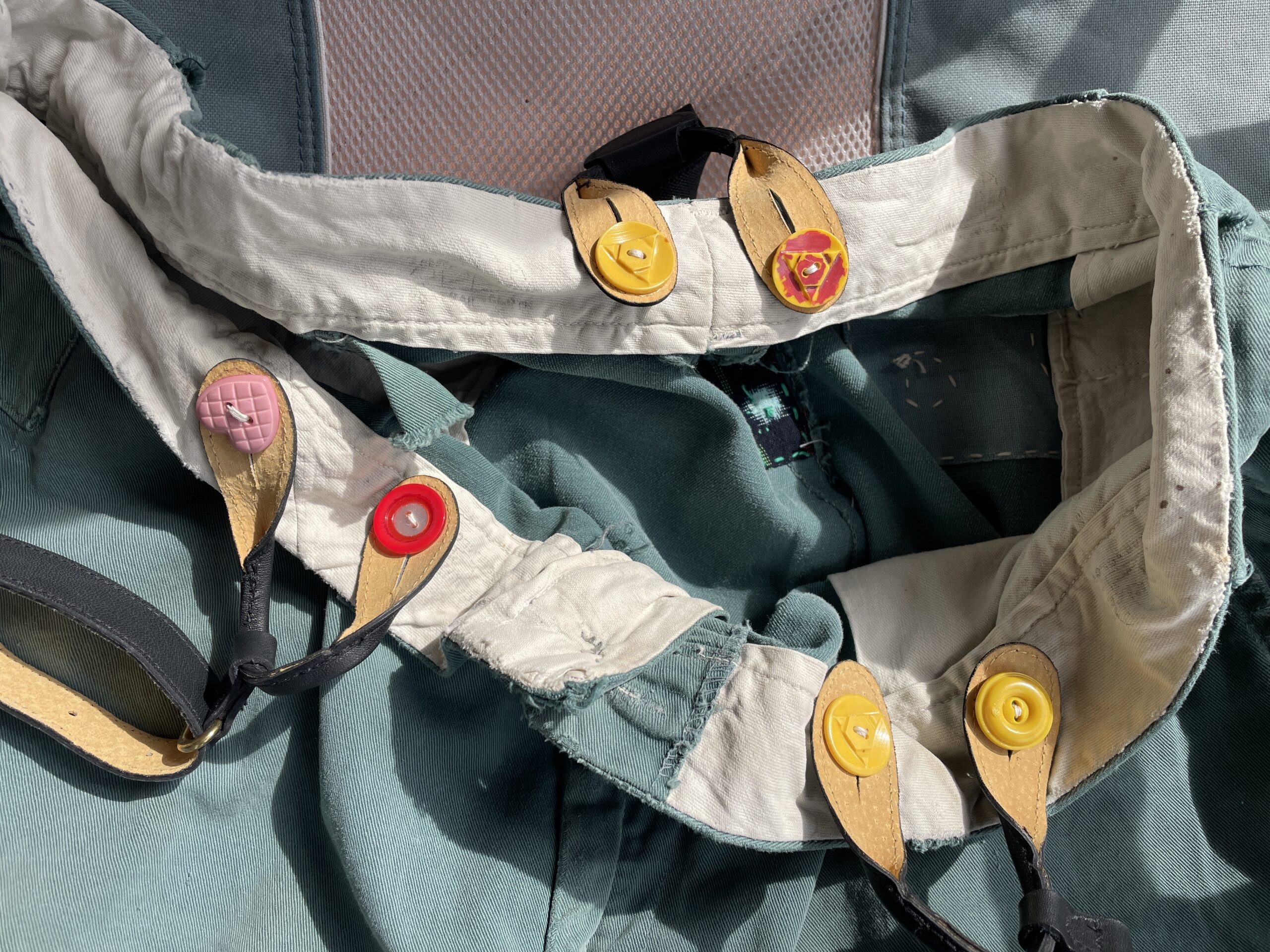 For the suspenders, I sewed on vintage buttons. I purchased a used pair of Coach leather suspenders on eBay.