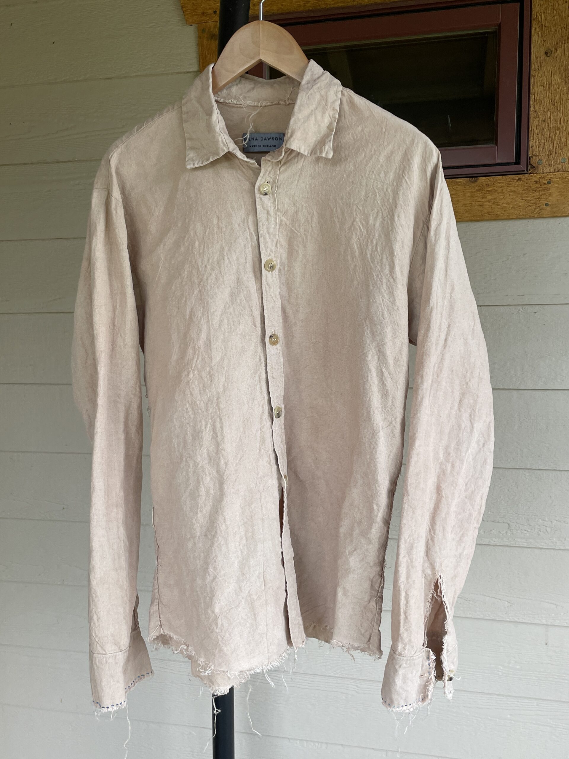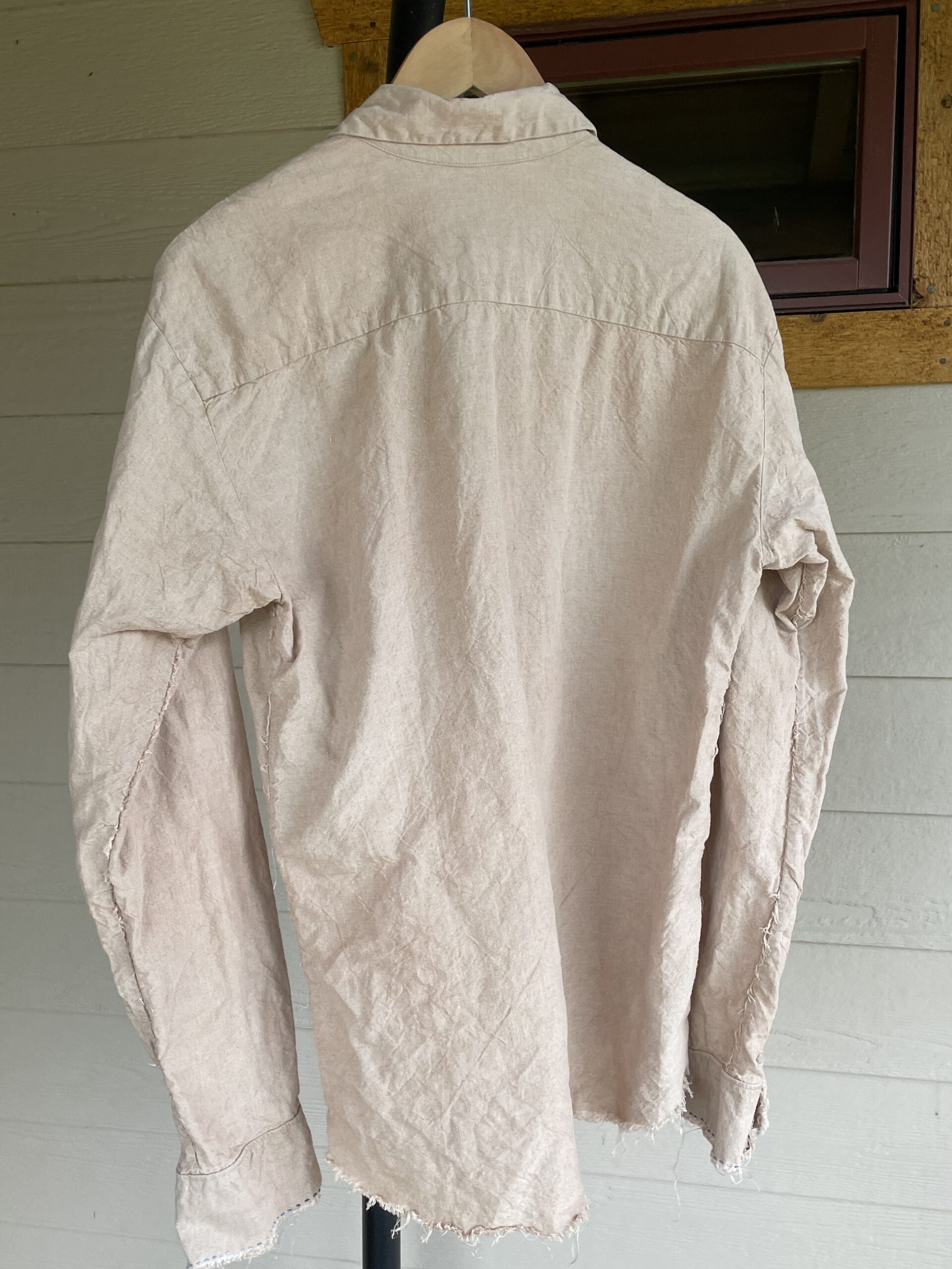 I purchased this Elena Dawson shirt used from Grailed. While it has raw edges, I found the unraveling of the cuffs annoying, so I chose to handstitch them.
